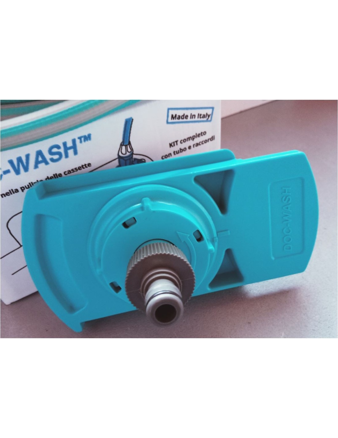 DOC-WASH è un accessorio compatto e facile da usare, che si collega direttamente alla presa d'acqua. Grazie a un getto d'acqua efficace, permette di sciacquare l'interno della cassetta senza bisogno di contatto diretto, eliminando i residui in modo rapido e igienico. Questo non solo riduce i tempi di pulizia, ma evita anche situazioni spiacevoli, rendendo l'intero processo molto più piacevole.
