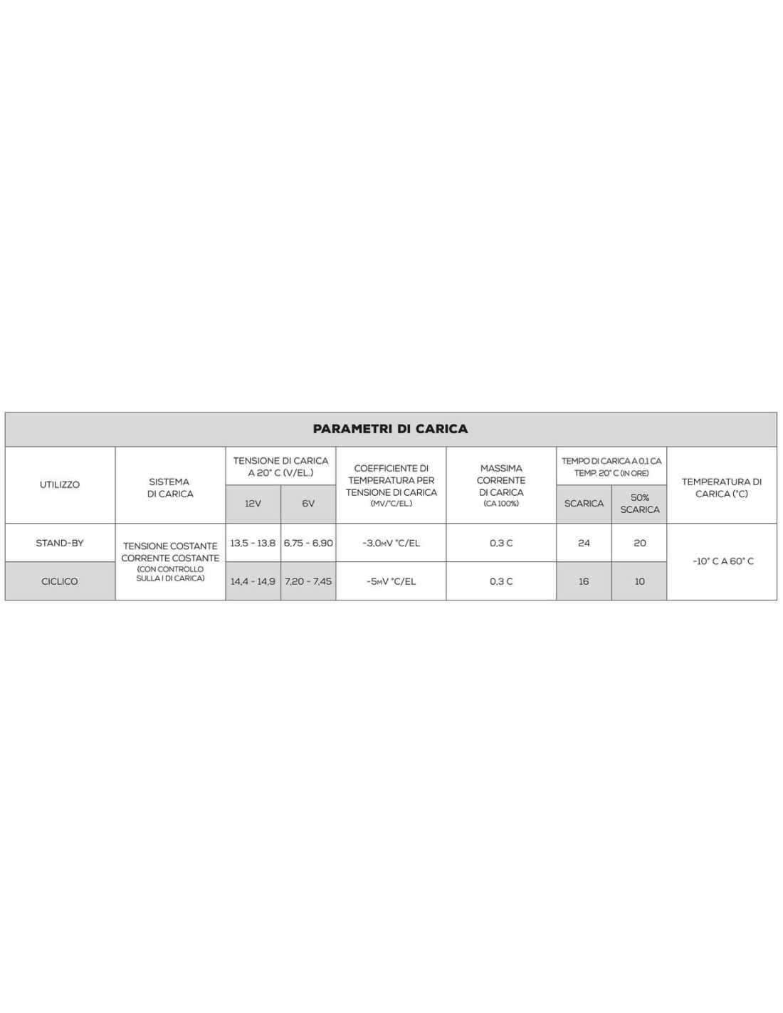 Le GREENPOWER possono essere caricate con alternatore, caricabatteria elettronico e pannelli solari, rispettando i parametri consigliati (Parametri di ricarica).