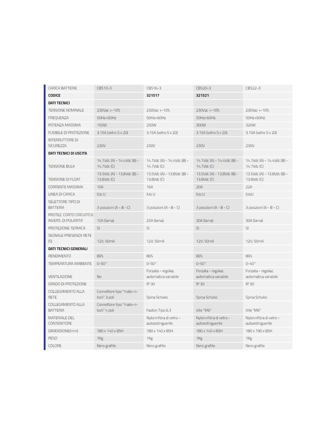 Successivamente la carica riparte dalla fase di Float. La tecnologia switching ad alta frequenza permette di ottenere elevati rendimenti con pesi e dimensioni ridotte.