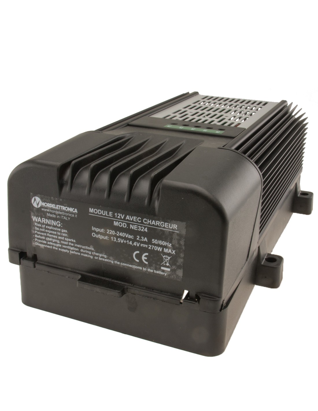 NE324 è un alimentatore specifico per il settore caravan. Può funzionare anche come carica batterie ed è progettato per ricaricare batterie al piombo, gel e AGM con tensione nominale di 12V.