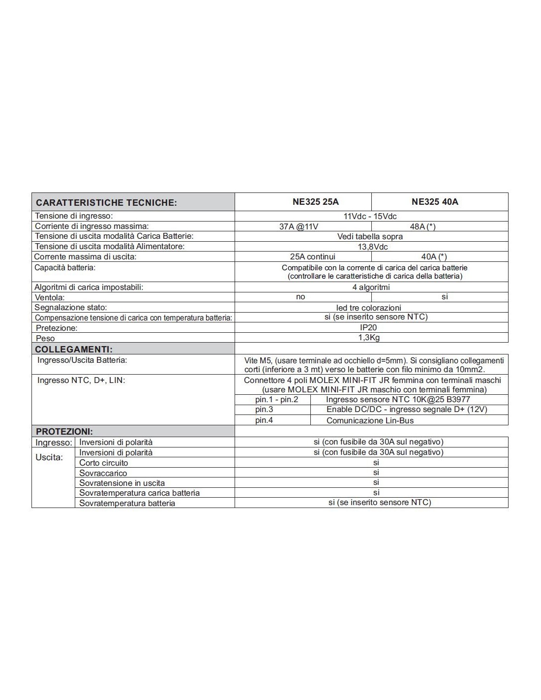 L’ NE325 funziona come carica batterie se all’accensione rileva una batteria in uscita (se è stato selezionato l'algoritmo per batterie al litio, il DC/DC funziona come carica batterie anche se non rileva la batteria all'accensione).