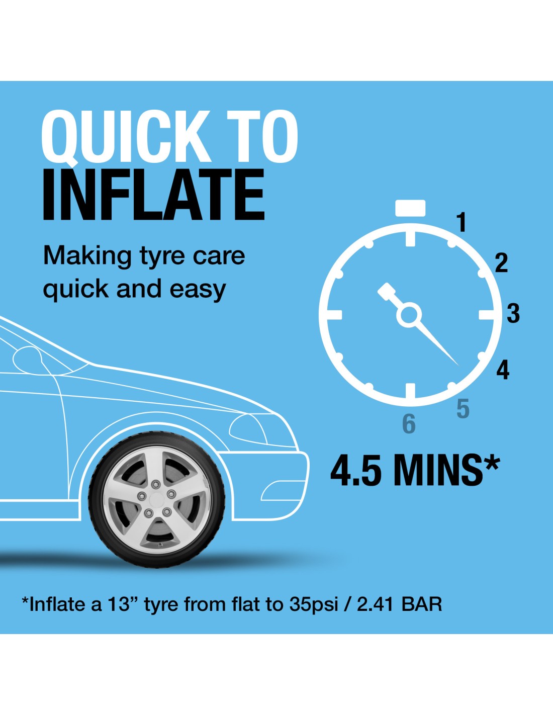 Gonfia uno pneumatico a 35PSI in meno di 4,5 minuti, risparmiando tempo.