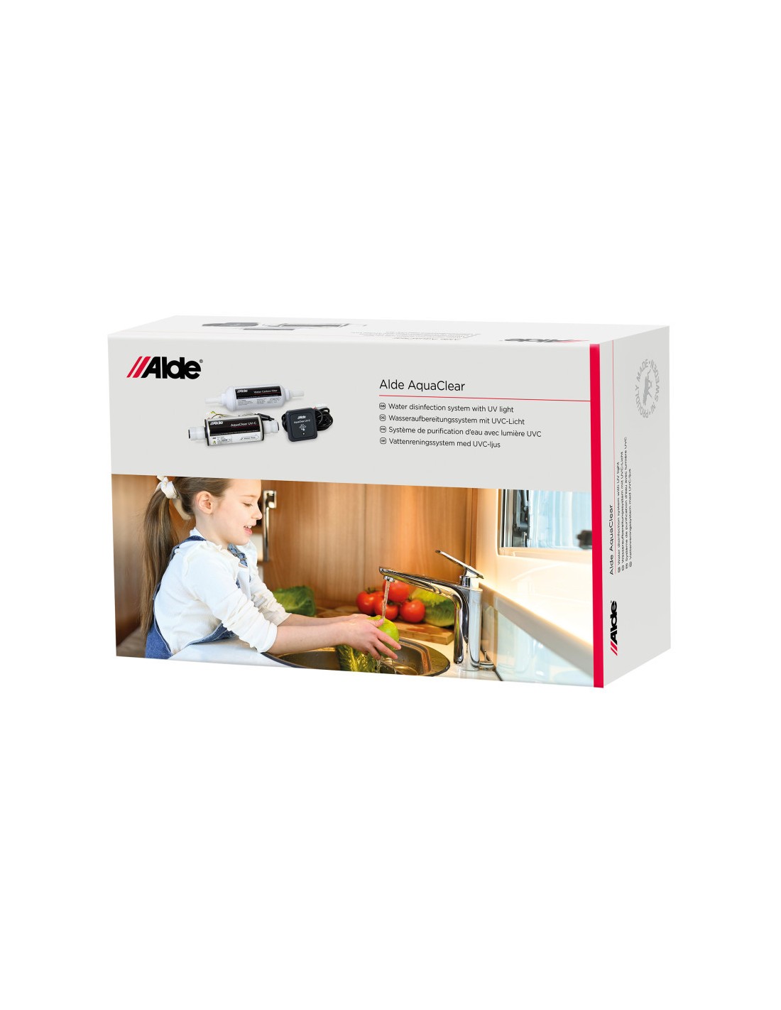 Alde AquaClear UV-C è un robusto ed efficiente prodotto per la disinfezione dell'acqua da 12 V per una maggiore sicurezza della qualità dell'acqua nei sistemi a bassa pressione in cui l'acqua viene reintegrata esternamente e immagazzinata in un serbatoio e dove il rischio di crescita microbiologica è quindi maggiore.