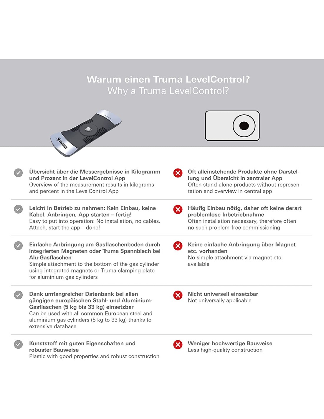 Truma LevelControl misura la quantità di gas nella bombola mediante ultrasuoni in modo rapido e preciso. Inoltre visualizza anche l’autonomia residua. Il sensore di livello trasmette i dati rilevati alla iNet Box.