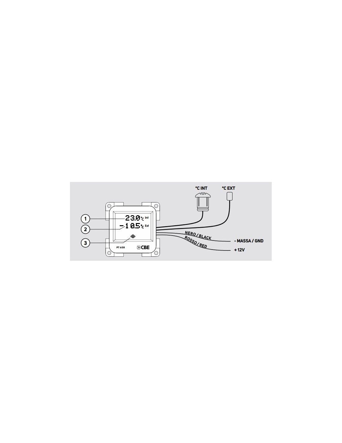 Pannello test digitale 12V a microprocessore per il controllo della temperatura interna "INT" e (Rif. 1) della temperatura esterna "EXT" . (Rif. 2) Per accendere la retroilluminazione premere leggermente 1 volta in corrispondenza del pulsante “touch” , la retroilluminazione rimarrà attiva per (Rif. 3) un tempo di 15 secondi. La visualizzazione delle temperature é espressa in °C con 0,5°C. step di In caso di guasto o mancato collegamento di un sensore temperatura, sul display appare la scritta “FAULT”.