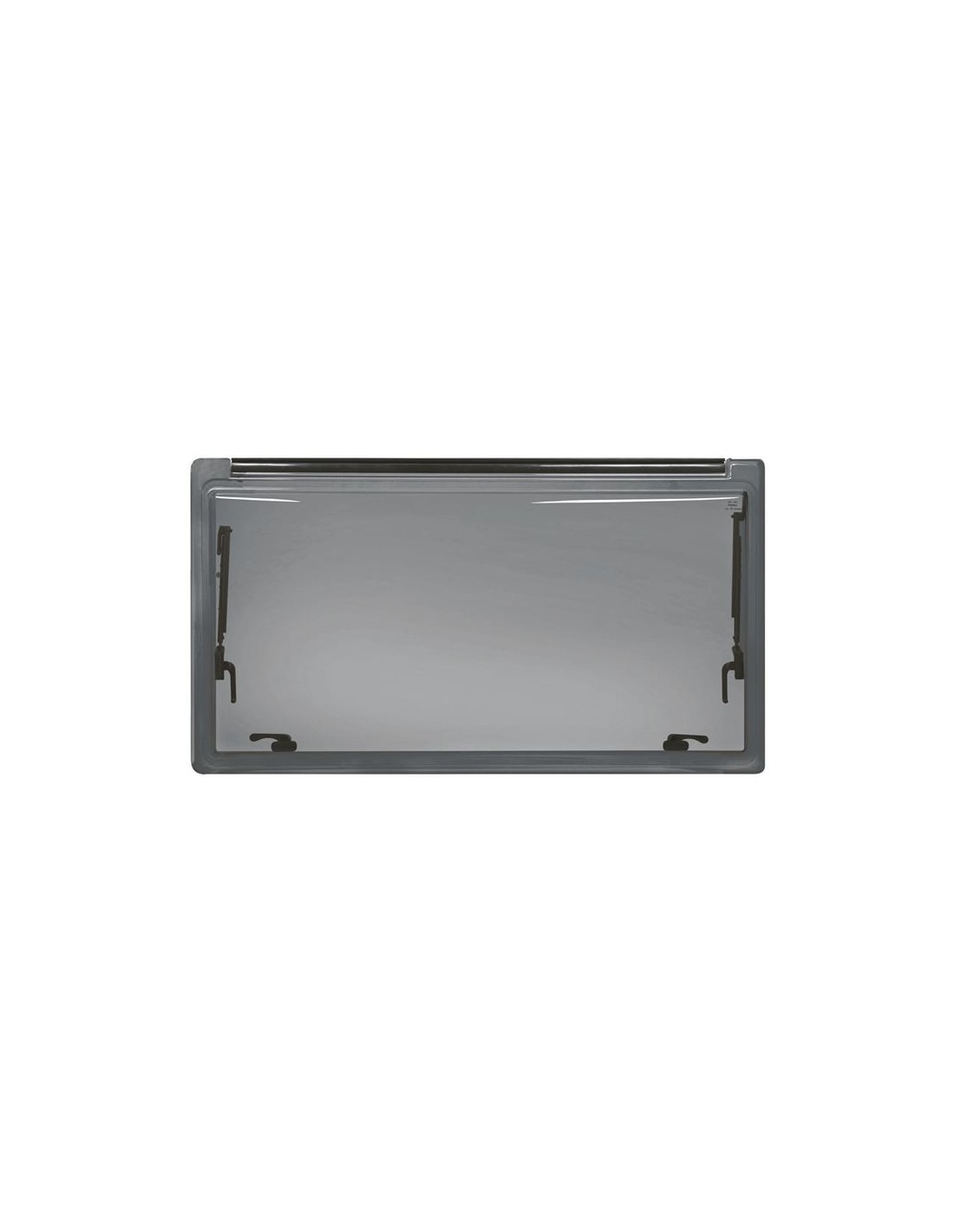 Doppio vetro in pmma (polimetilmetacrilato) grigio fumè (923), senza serigrafia e cerniera integrata.