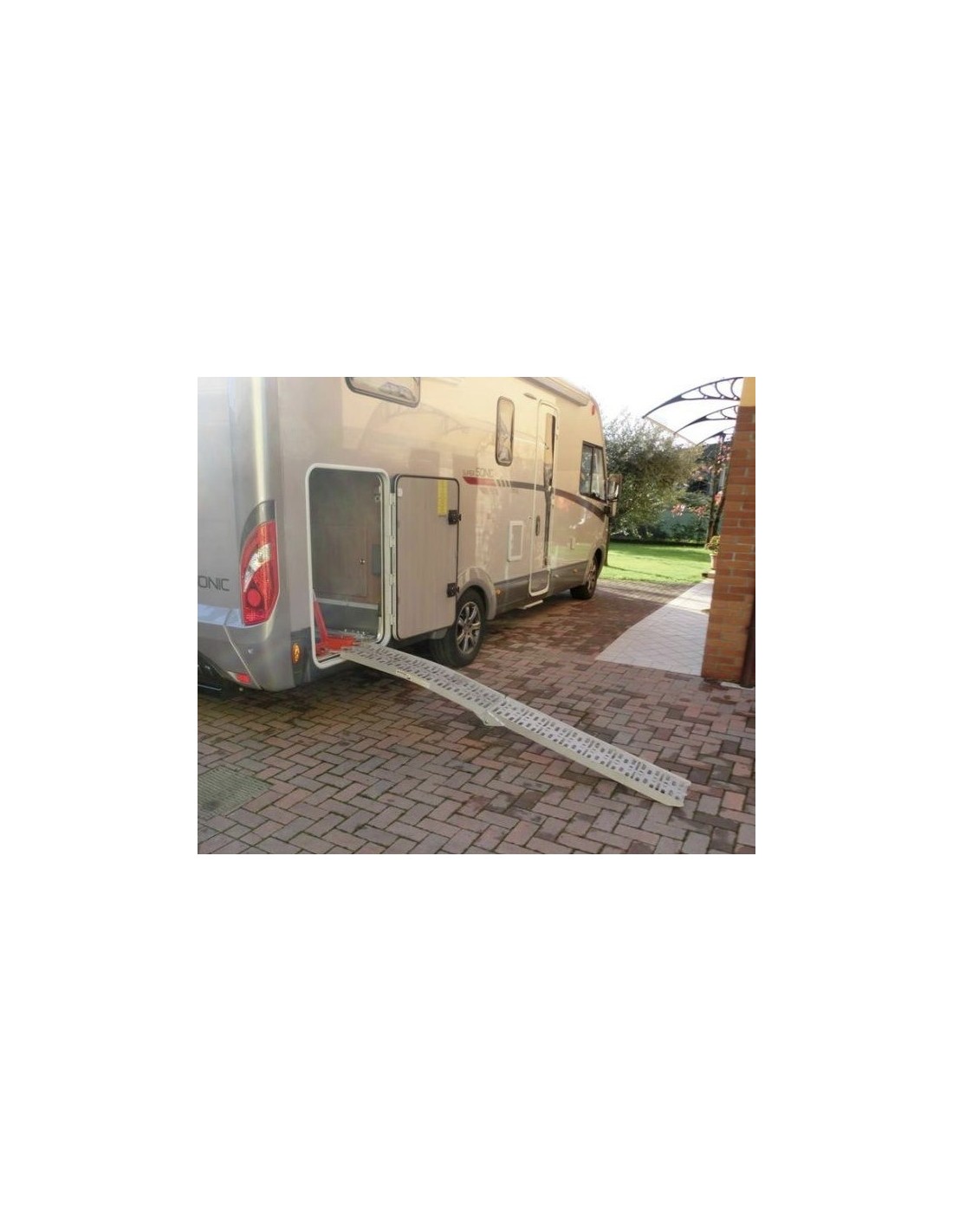 Lunghezza rampa aperta 225 cm. chiusa 120 cm. larghezza 28 cm. max capacità di carico kg. 340 distribuiti su tutta la rampa cinghia di ancoraggio.