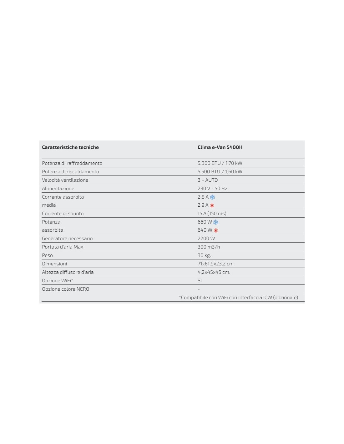 Il Modello CLIMA e-VAN 5400H è stato progettato per un basso consumo e può essere anche collegato a una batteria attraverso un inverter a onda sinusoidale pura di almeno 1500W (Regime) per essere utilizzato con il veicolo in movimento.