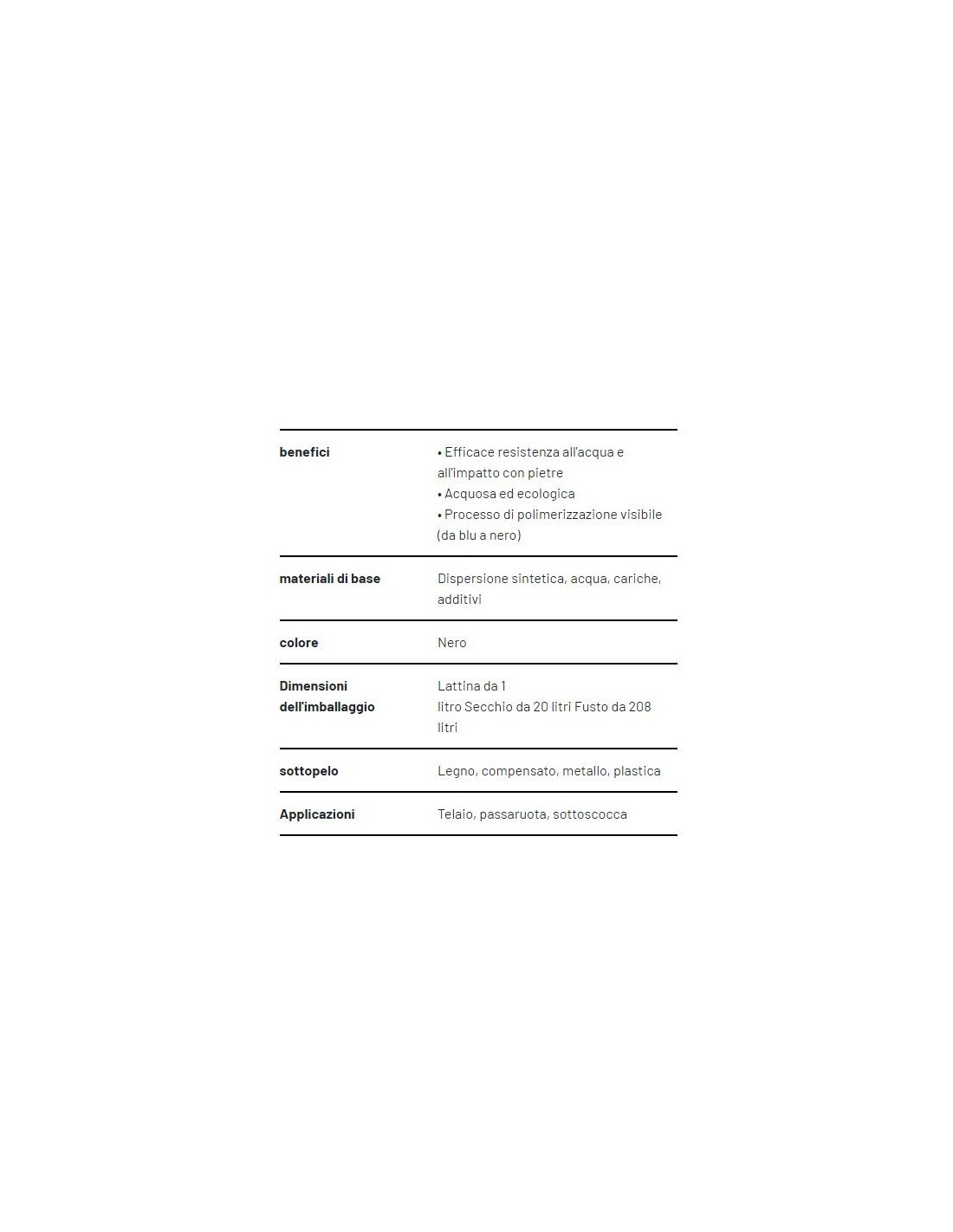 Prodotto a base d'acqua, rapida essiccazione, rispettoso dell'ambiente, protezione da pietre, ottima resistenza agli agenti atmosferici, spruzzi d'acqua e abrasione.