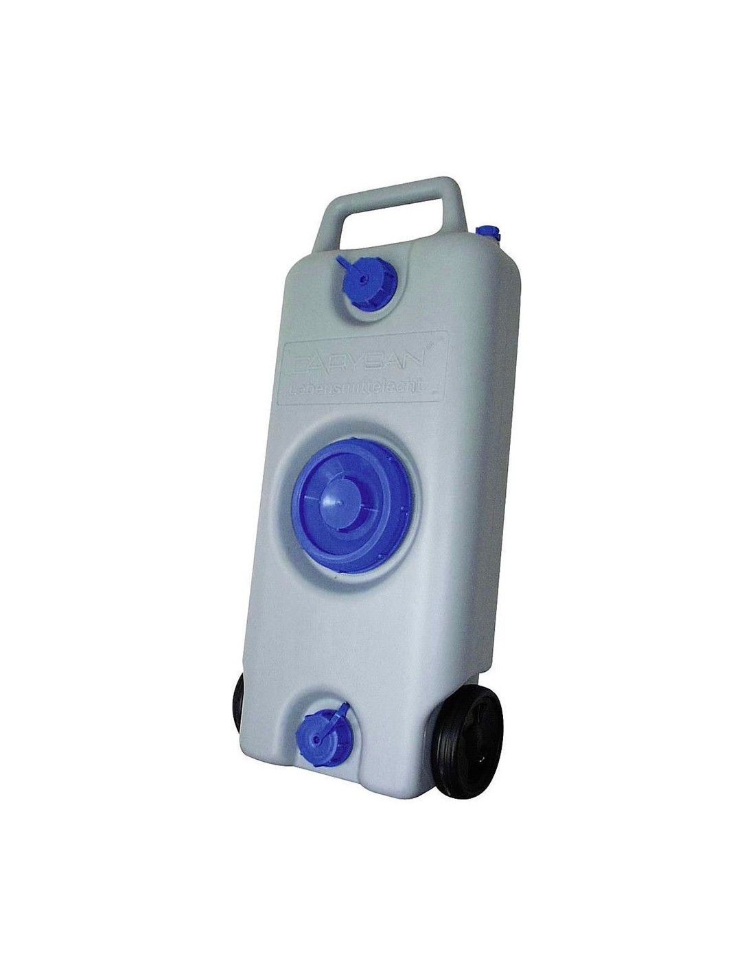 In polietilene HDPE per uso alimentare, con maniglia di trasporto e pneumatici in PVC.