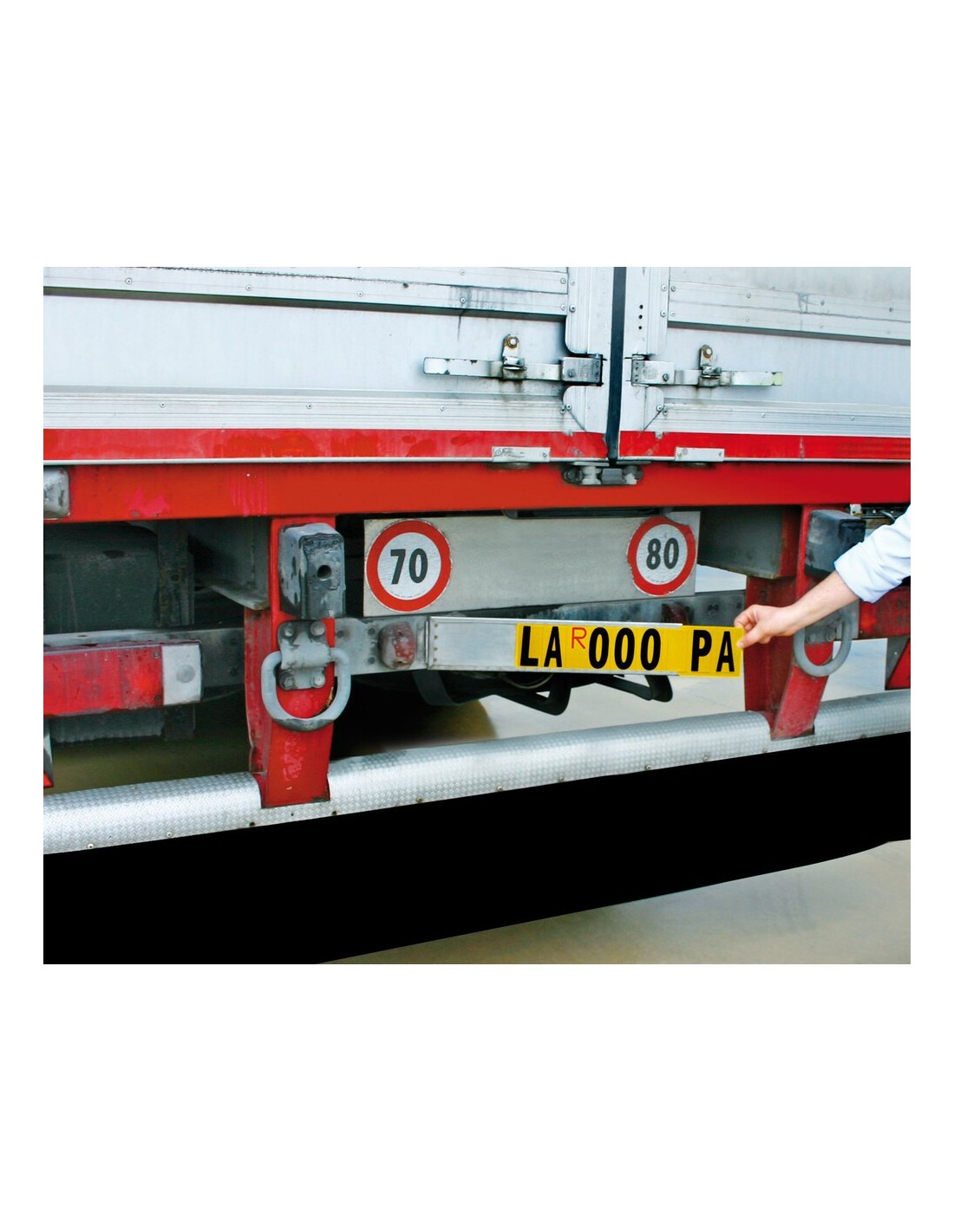 In alluminio con pellicola catarifrangente. Versione italiana. Spaziature delimitate per una facile applicazione di lettere e numeri adesivi H80 mm. Fornite 2 lettere R rosse adesive.